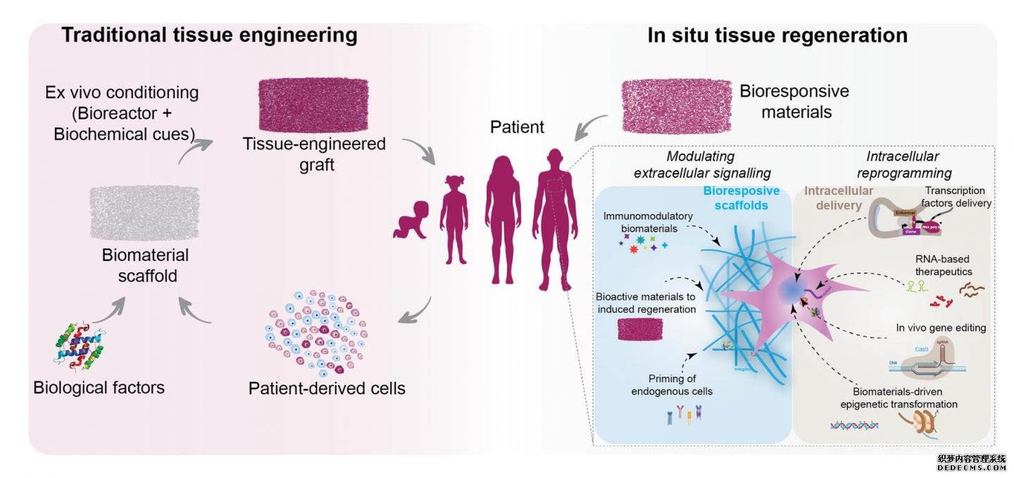 生物材料的另一个重要影响是在它的使用“重新编程”的身体再生细胞的遗传水平。生物材料可以提供控制基因表达的因素,这些基因表达是将细胞从一种类型转换为另一种类型所必需的。其他因素可能会导致组织修复所需的蛋白质的生产。此外,生物材料还可以通过携带基因编辑工具的纳米颗粒传递其他因素。这些工具可以在参与愈合过程的细胞内进行精确的基因编辑。