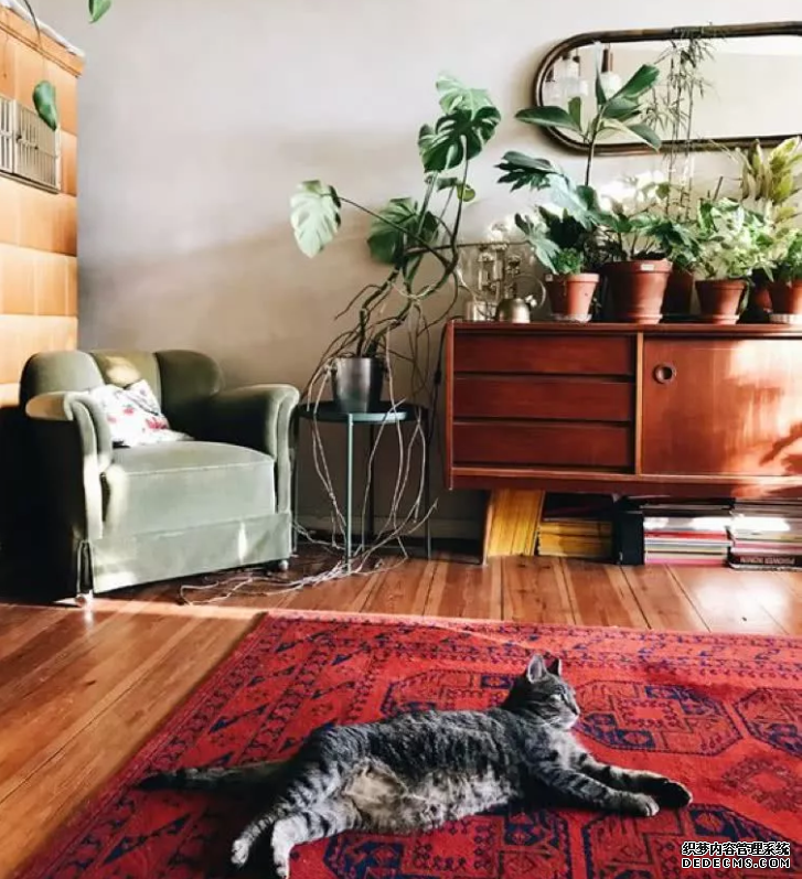 MCM中古风格的家具配柚木地板、波斯地毯以及大量绿植和挂画是经典搭配
