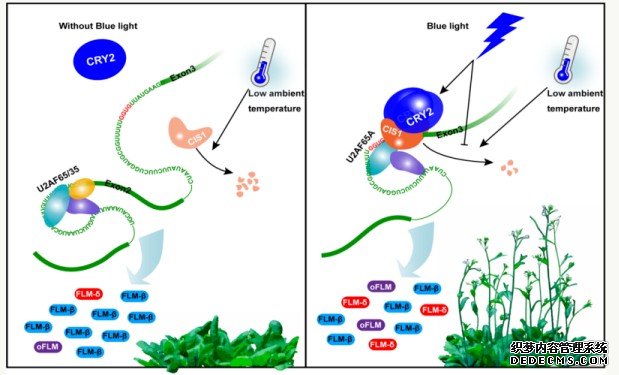 杏耀平台总代 ,从而影响基因表达和植物发育。蓝光和CRY可以通过调控CIS1而调控大量基因的RNA选择性剪接,包括在温度调控开花中具有重要功能的FLM。FLM前体mRNA随着环境温度的变化而发生选择性剪接变化。FLM β剪接形式在低温下积累从而抑制开花。CIS1与FLM前体mRNA结合以调节其选择性剪接,而CRY2调节CIS1的RNA结合活性。因此,蓝光通过CRY2-CIS1-FLM信号通路调节温度调控的开花,且该信号通路将开花反应与光照和环境温度联系起来。